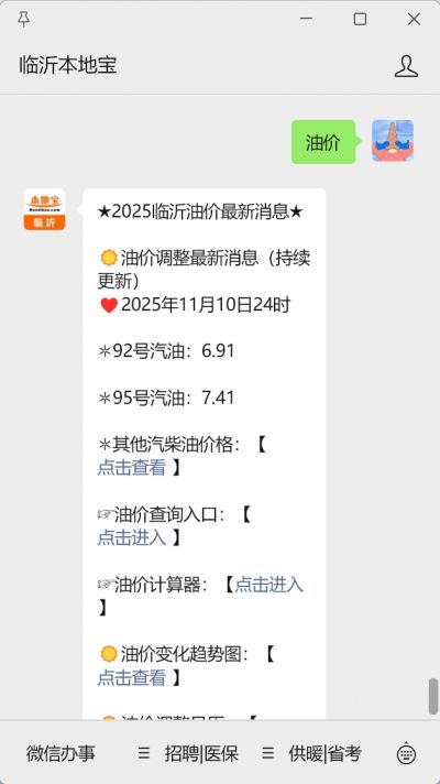 温馨提示:微信搜索公众号【临沂本地宝】,关注后在对话框回复【油价】可获临沂油价查询入口、油价费用计算器、89/32/95号汽油最新价格、0/-10号柴油最新价格、油价趋势等。